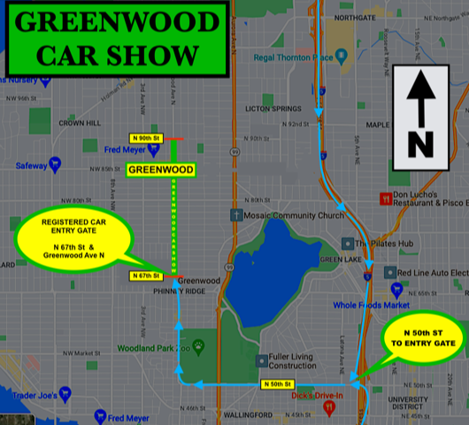 The show takes place on Greenwood Ave North, between 67th St and 90th St. Street parking is available throughout the Greenwood/Phinney Ridge neighborhood. We do not have dedicated parking. From I-5, take either the 50th St. exit westbound to Phinney Ave (Woodland Park Zoo) and head north on Greenwood or take the 85th St exit and head west to Greenwood Ave.